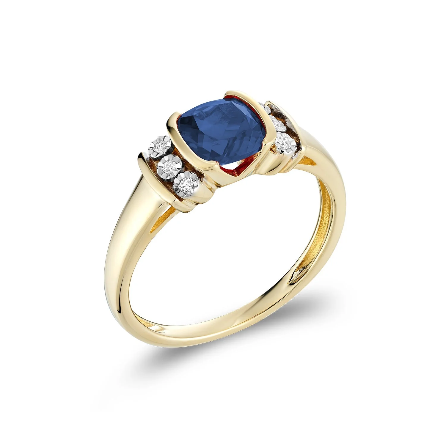This 10k yellow gold ring is set with a lab-created sapphire and natural diamonds.