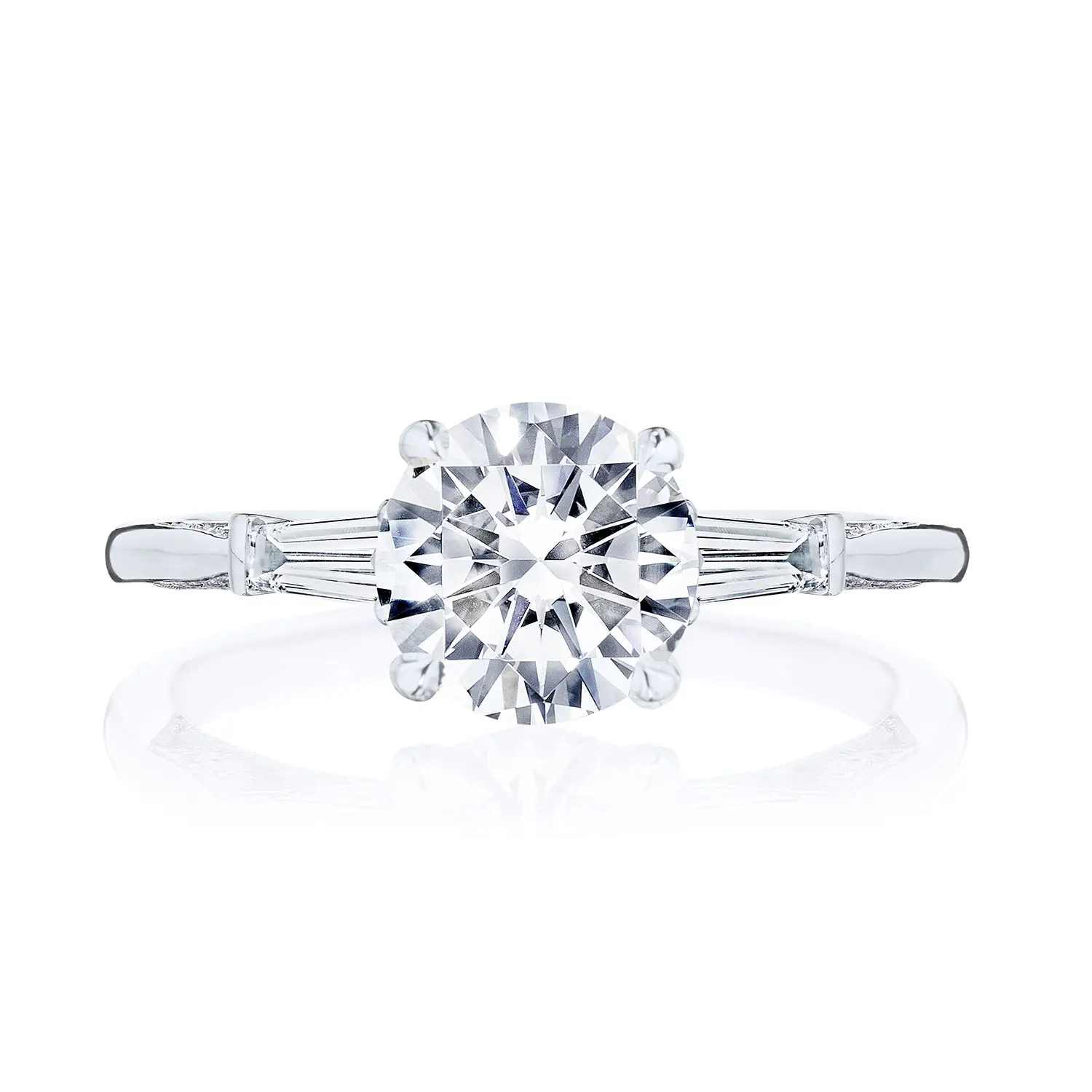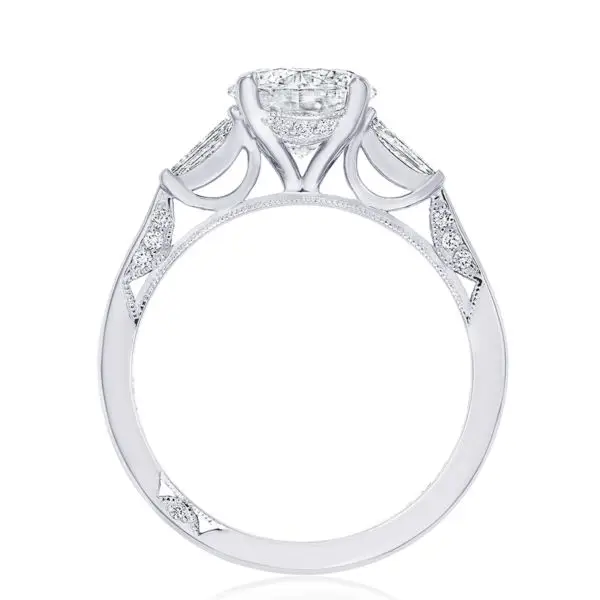 This Platinum Simply Tacori Round 3-Stone Engagement Ring stands out by contrasting your side stones with your centre diamond! Baguette side stones graduate to the round centre, bringing a magical contrast to bring about beauty from every angle.