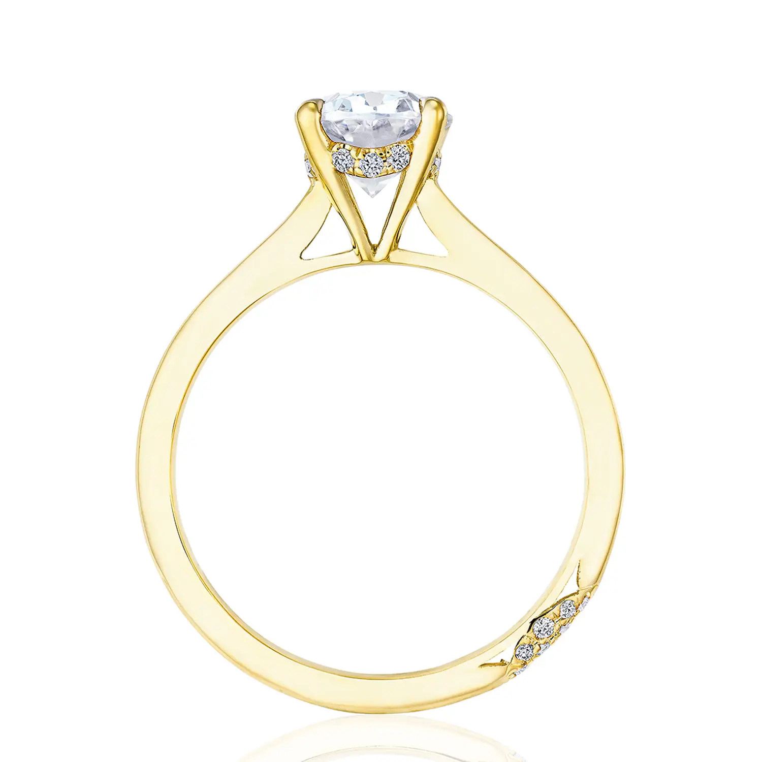 This stunning 18k yellow gold four-prong, solitaire engagement ring features a oval-cut center stone on a high-polished band. Discover the hidden bloom of diamonds underneath the crown and the diamond-studded crescent signature at the foundation.
