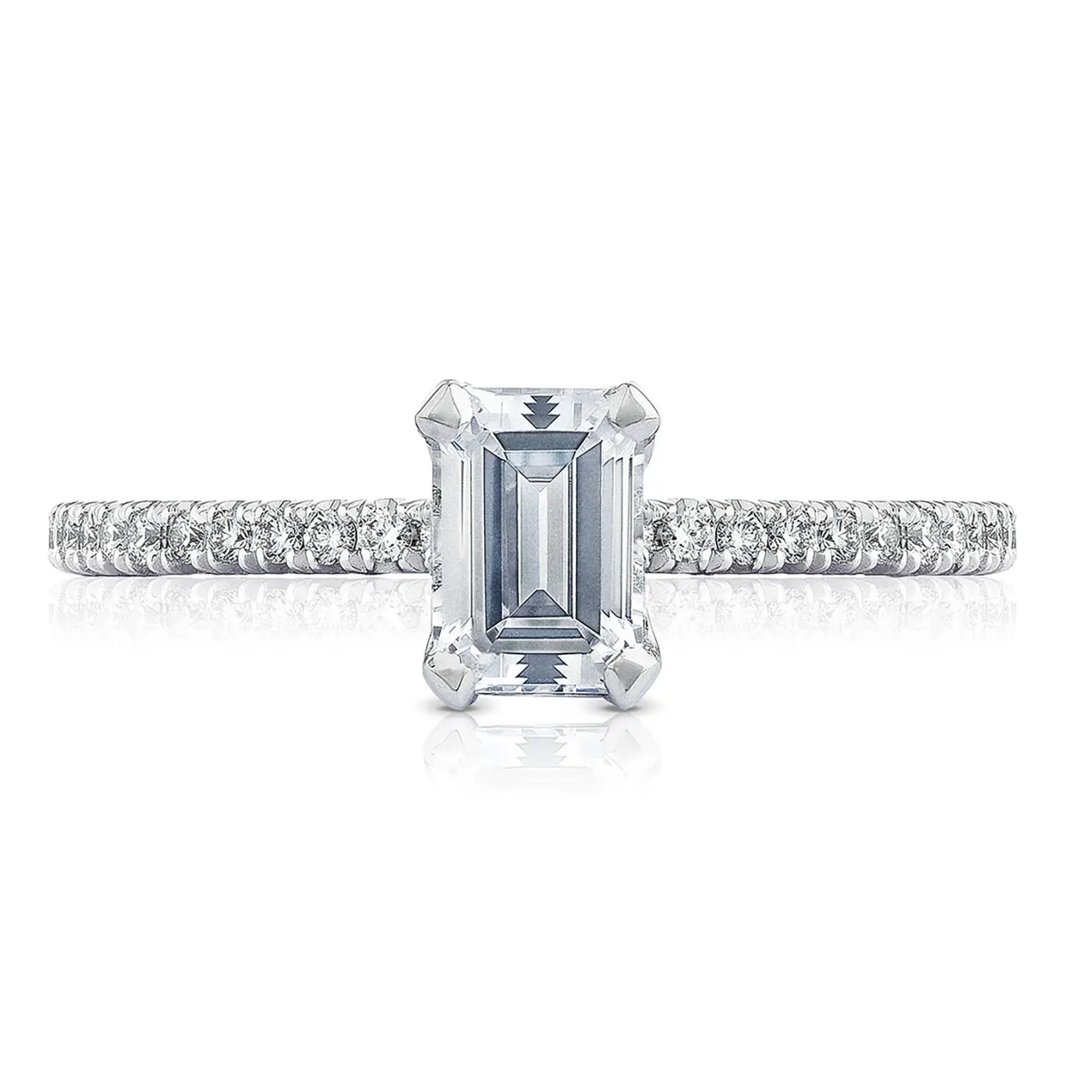 This Platinum Tacori Petite Crescent Emerald Solitaire Engagement Ring with a French cut setting, there is less metal so that all of the diamonds on the 1.5mm foundation shine brighter and reveal the beauty of the emerald cut center.